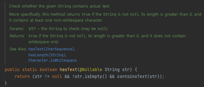 StringUtils.hasText(str)는 str이 null이 아닌 경우, 길이가 0보다 큰 경우, 공백이 아닌 문자를 포함하고 있는 경우 true를 리턴한다.