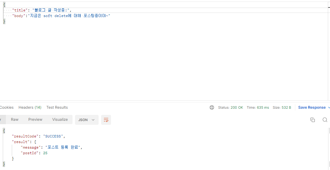 위와 같이, postId가 25번인 게시글이 등록되었고, 이 게시글에 대한 댓글이 2개 존재하는 상황이 만들어졌습니다.