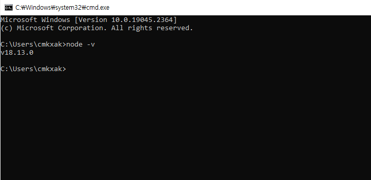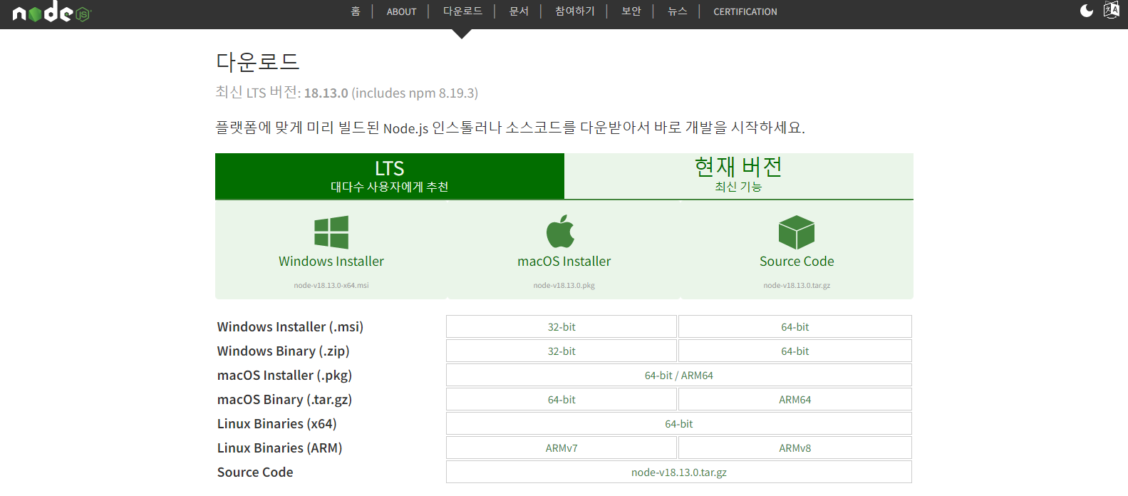 위와 같이, 정상적으로 Node.js가 다운로드된 것을 볼 수 있습니다.